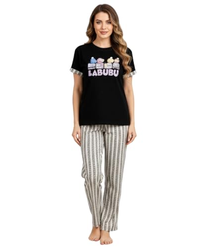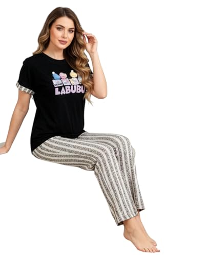 Generic - بيجامة صيفي نص كم تيشيرت بتصميم شعار و بنطلون بتصميم منقوش خامة قطن للنساء