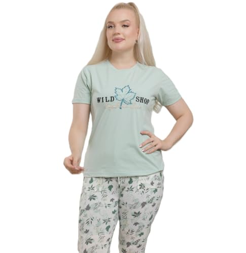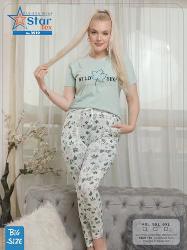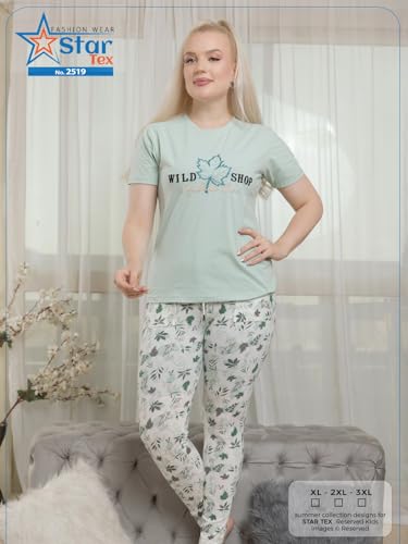 Generic - بيجامة صيفية من القطن الناعم مريحه للنساء والبنات مكونة من قطعتين بنطلون وتيشيرت - تطريز بيج سايز