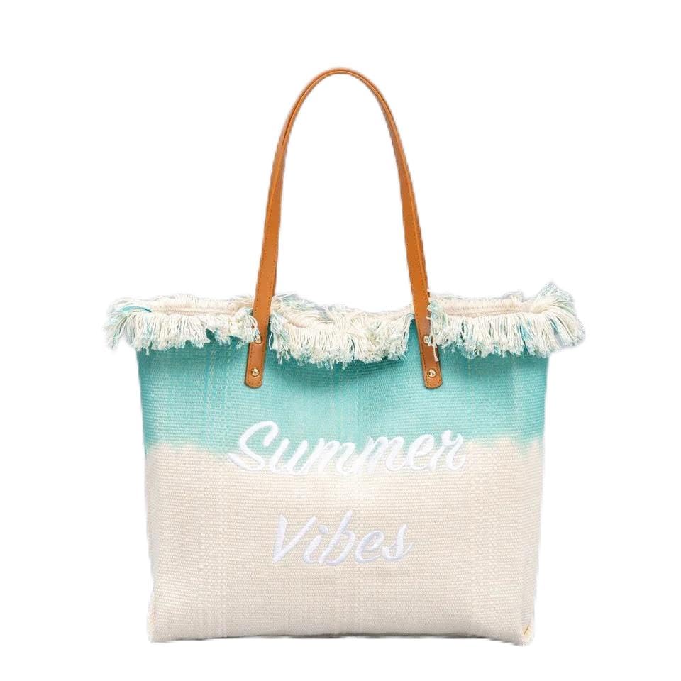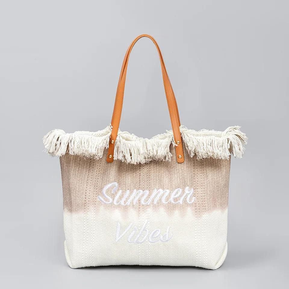 Generic - شنطة توت للشاطئ من سمر فايبس، قماش مع حواف بشراشيب، تصميم متدرج، مقابض جلدية بلون بيج داكن