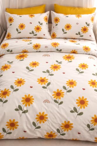 Generic - طقم غطاء لحاف بتصميم عباد الشمس، أبيض وأصفر، مقاس كبير 220×240 سم، يتضمن غطاء لحاف و2 كيس وسادة 50×70 سم مع سوستة