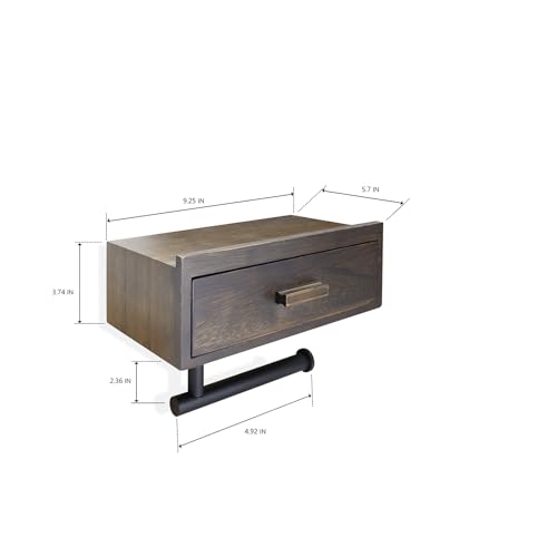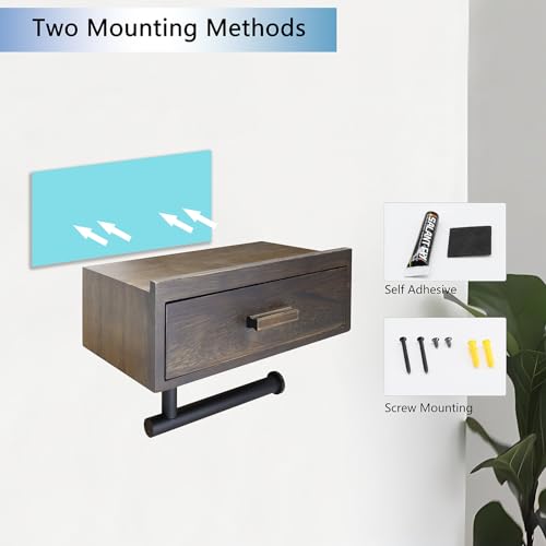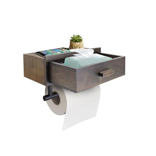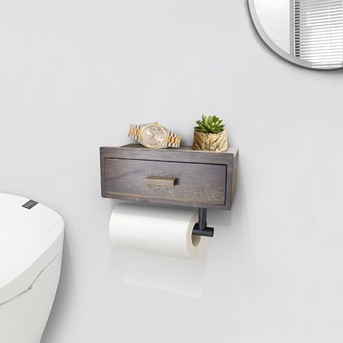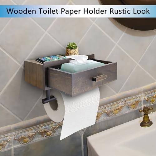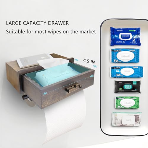 SUNLOVING - حامل ورق تواليت خشبي مع رف، قابل للتثبيت على الحائط أو باللاصق بتصميم من الطراز الريفي مع درج تخزين وحامل مناديل مبللة للحمام من صن لوفينج - بني