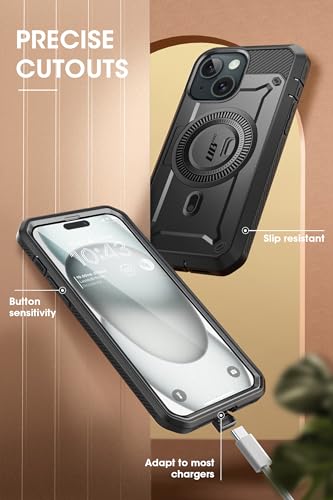 SUPCASE - جراب بتصميم يونيكورن بيتل برو ماج لموبايل آيفون 15 / آيفون 14 / آيفون 13 6.1 بوصة، جراب متين لكامل الجسم مع شاشة حماية مدمجة ومسند ومشبك حزام من سبكيس (اسود)