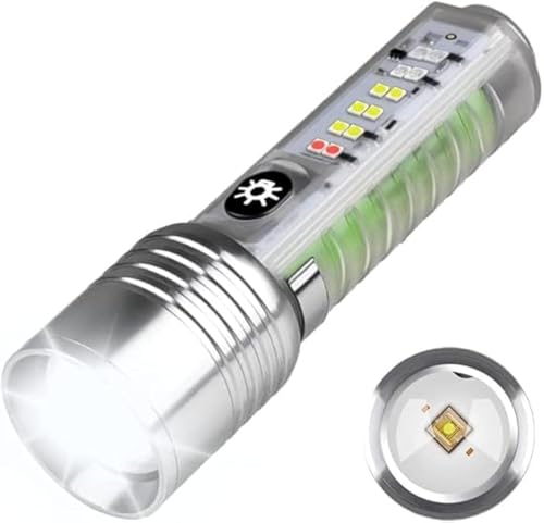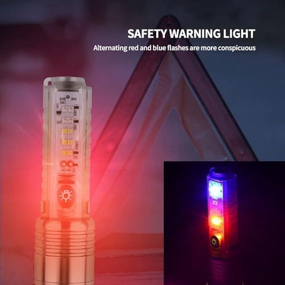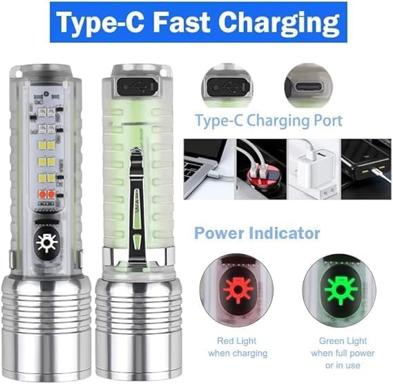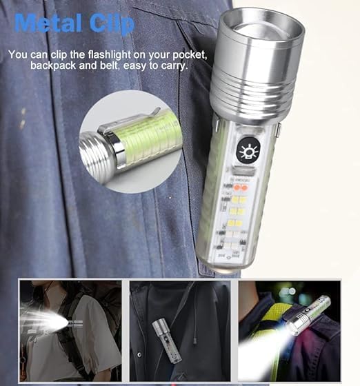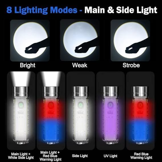 - 8 أوضاع إضاءة ومتعددة الوظائف】 اضغط على المفتاح لمدة ثانيتين للتشغيل. ضوء قوي - ضوء ضعيف - وميض - ضوء قوي + ضوء أبيض جانبي - ضوء قوي + ضوء وامض أحمر أزرق - ضوء أبيض جانبي - ضوء أبيض - ضوء الأشعة فوق البنفسجية - ضوء وامض أحمر أزرق. يمكن استخدام مصباح يدوي بـ 4 مصادر إضاءة للتخييم والمشي والسفر وأعمال الصيانة وأضواء التحذير الليلية وفحص الأوراق النقدية وما إلى ذلك.