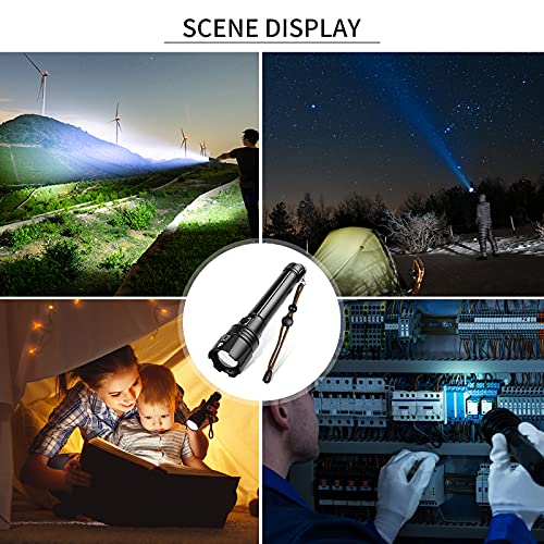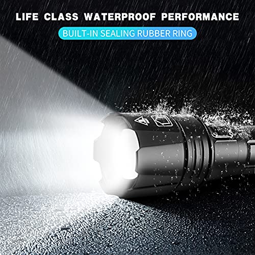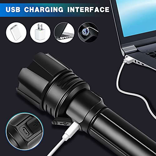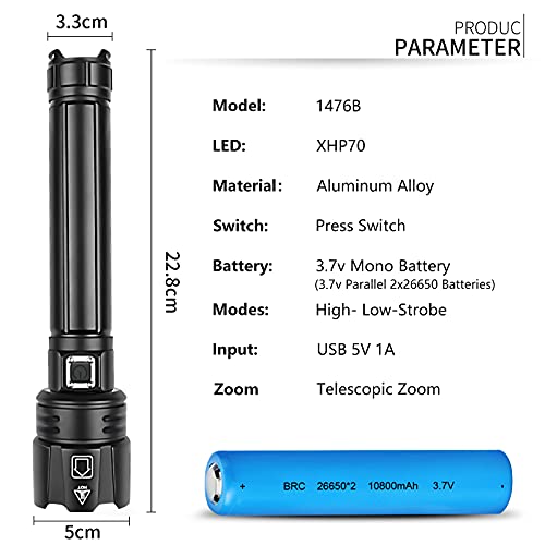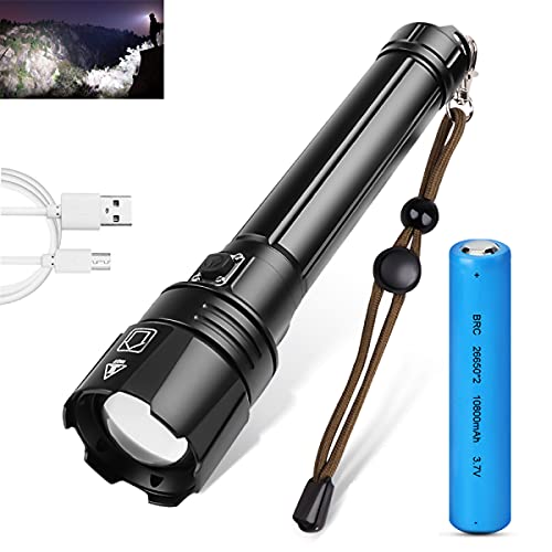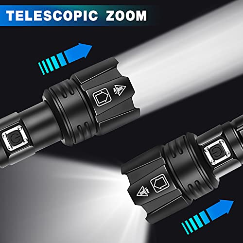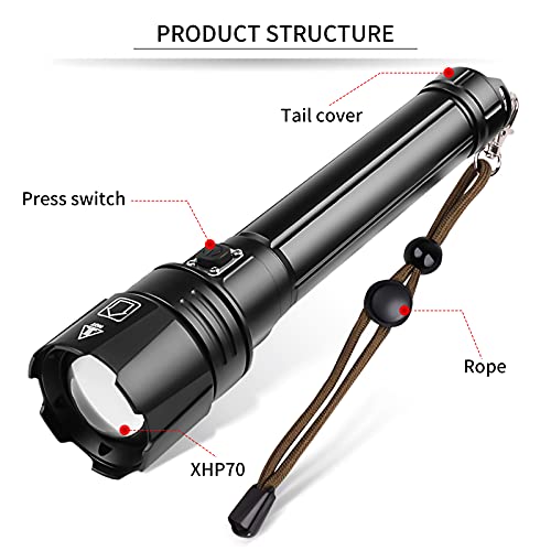 LIUMYARTISTORE - مصباح يدوي تكتيكي فائق السطوع، فئة LED XHP70 بكمية اضاءة 90000 لومن مع بطارية موازية 10000 ميللي امبير في الساعة، قابل للتكبير وضد الماء بتصنيف IPX5 وشحن USB، كشاف 3 اوضاع للخارج والطوارئ والمنزل