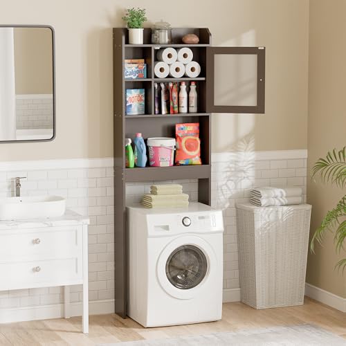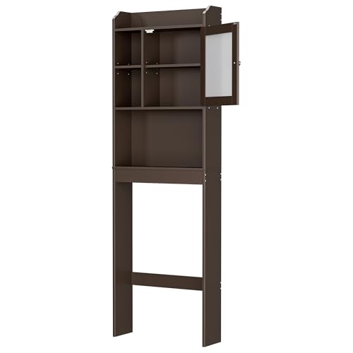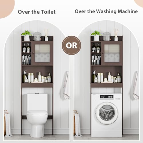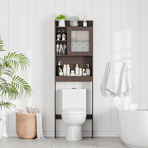 SUPER DEAL - سوبر ديل خزانة تخزين للحمام توضع فوق المرحاض، منظم حمام خشبي قائم بذاته مع ارفف قابلة للتعديل وباب زجاجي، بني