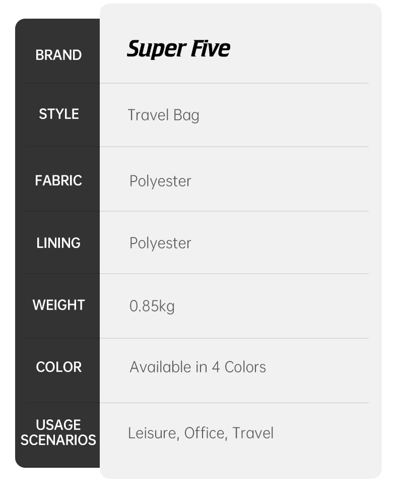 - عدد الأقسام: 1 جيب أمامي بسحاب + 1 جيب رئيسي + 1 جيب للأحذية + 2 جيب جانبي
