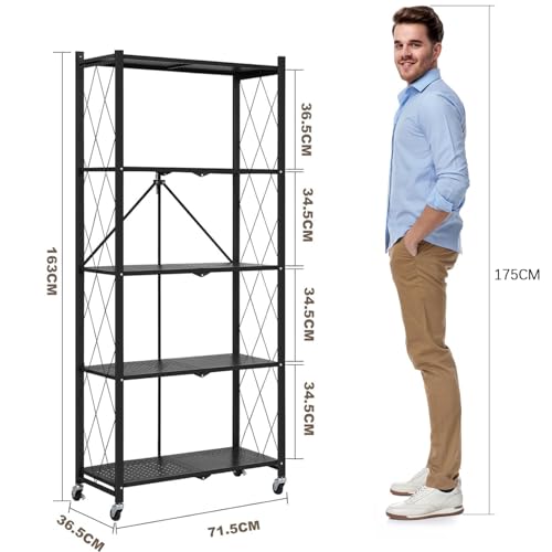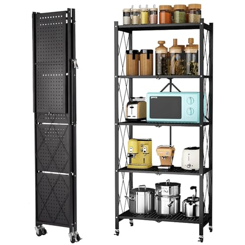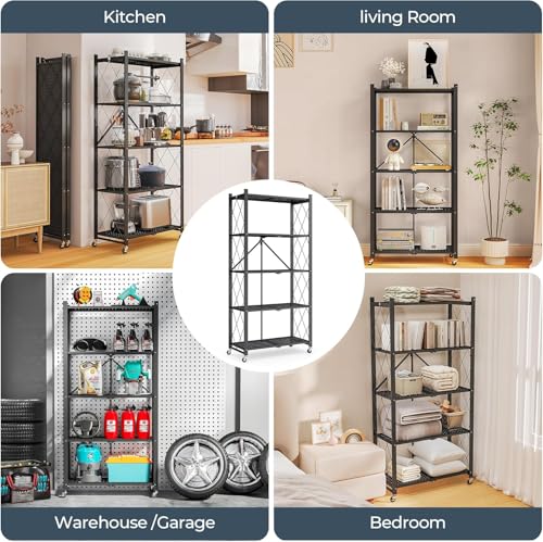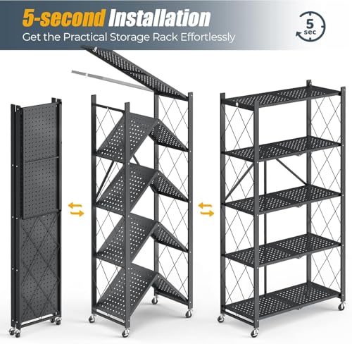 SupWolf - رف تخزين من 5 طبقات مع عجلات، رف تخزين قابل للطي شديد التحمل، ارفف قابلة للطي بسعة كبيرة للمراب والمطبخ والقبو والمخزن والخبازين ورف منظم قابل للطي من ساب وولف