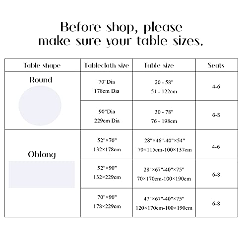 - المقاس المقترح - 70 × 70 انش مخصص للطاولات مقاس 20-48 انش التي تتسع لـ 4-6 أشخاص، كل طرف يسقط حوالي 11-20 انش، 90 × 90 انش مفرش طاولة دائري مخصص للطاولات 30-78 انش أن المقاعد 6-8 الأشخاص، كل قطرة تقريبًا 9-12 انش، 70 × 90 انش تناسب الطاولات مقاس 47.2 × 67.3 انش - 39.33 × 74.1 انش تتسع لـ 6-8 أشخاص