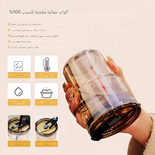 - مادة فاخرة -- الكوب والقشة مصنوعان من زجاج متين. الغلاف الجلدي المقاوم للحرارة والغطاء المانع للتسرب من البولي بروبيلين آمن غذائيًا. كما أنه شفاف تمامًا، مما يسمح لك برؤية ما تشربه بالضبط ومقدار الكمية المتبقية.