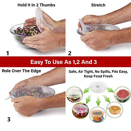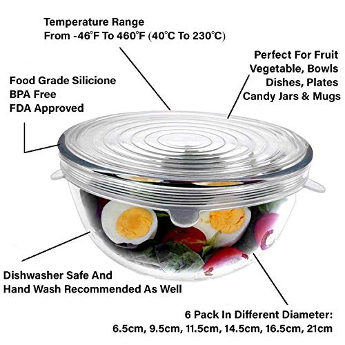 - تأتي أغطية علب التخزين المصنوعة من السيليكون بـ 6 أحجام. مانعة للتسرب مع سدادة محكمة الغلق حتى تبقى الأطعمة طازجة ولذيذة. سهلة التنظيف وآمنة للاستخدام في غسالة الأطباق. مضادة للانزلاق ومضادة للسقوط ومقاومة للتآكل وليس من السهل أن يتغير شكلها.