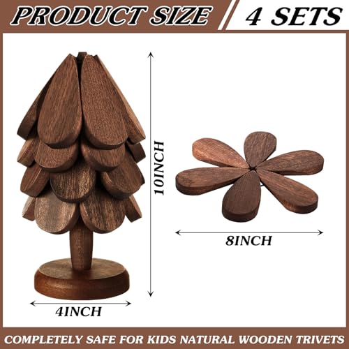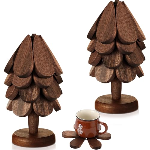 Suzile - سوزدل مجموعة من قطعتين من الركائز الخشبية للاطباق الساخنة على شكل شجرة، مجموعة قواعد اكواب شجرة، حصيرة طاولة خشبية بتصميم شجرة قابلة للطي، وسادات مقاومة للحرارة لابريق الشاي ووعاء المطبخ (4 طبقات)