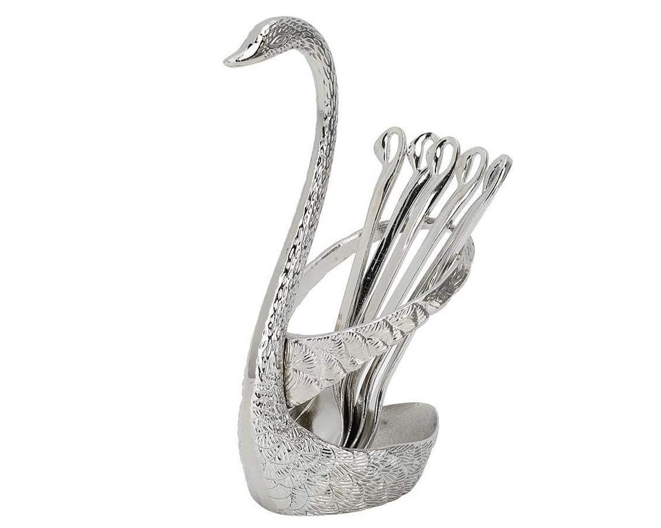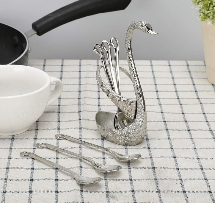 Generic - أدوات المائدة مع حامل بتصميم بجعة، مجموعة أدوات المائدة، مجموعة أدوات مائدة، أدوات فاكهة للمنزل والفندق والقهوة (بجعة بريش فضي مع ملعقة)