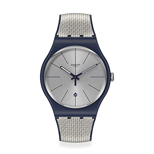 Swatch - ساعة انالوج دائرية بلونين من السيليكون ومينا أبيض للجنسين سواتش - لون رمادي وكحلي