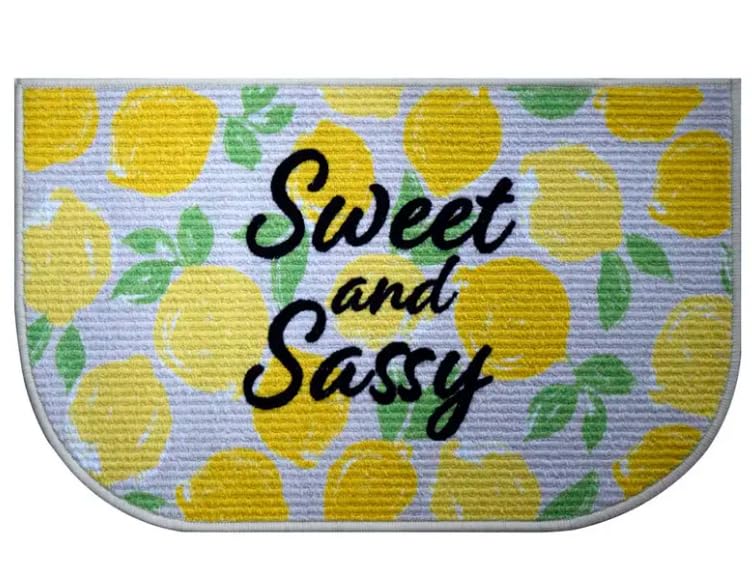 - تصميم ساحر: يتميز بنمط ليمون مبهج مع نص "Sweet and Sassy" باللونين الأصفر والأخضر على خلفية فاتحة، مما يضيف لمسة مشرقة ومرحبة إلى مطبخك أو مدخلك