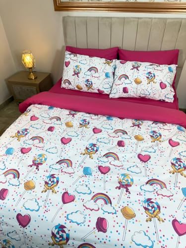 Generic - Sweet Dreams طقم غطاء لحاف أطفال, قطن عامريه, أبيض مع نقوش حلويات وقلوب, مقاس 180×200 سم, مع خدادية 50×70 سم, تصميم قوس قزح ولوليبوب