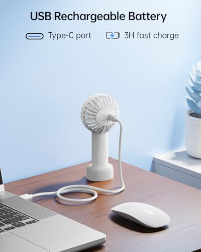 SWEETFULL - مروحة صغيرة محمولة قوية قابلة لإعادة الشحن، مروحة يد شخصية صغيرة بـ 3 سرعات للسفر والمكياج والرموش للأطفال والبنات والنساء بتصميم لطيف بمنفذ USB لون أبيض