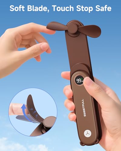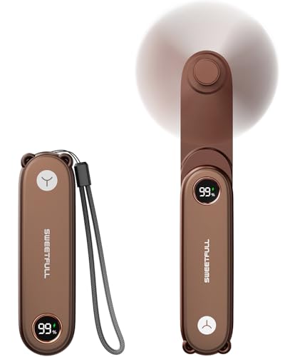 SWEETFULL - مروحة صغيرة محمولة مع شاشة ليد من سويتفول شخصية 2 في 1 قابلة للطي وقابلة لإعادة الشحن بمنفذ USB ومصباح يدوي للسفر والرموش جيب لطيفة للنساء والبنات بني 5.0 واط