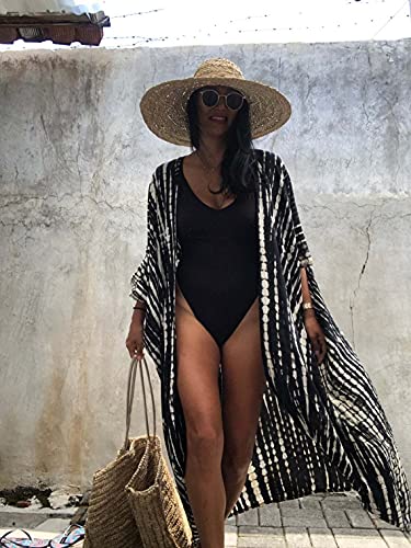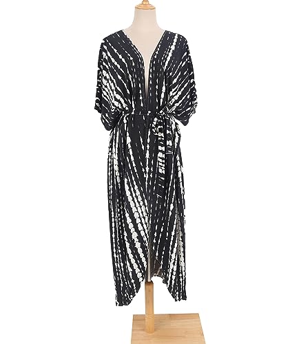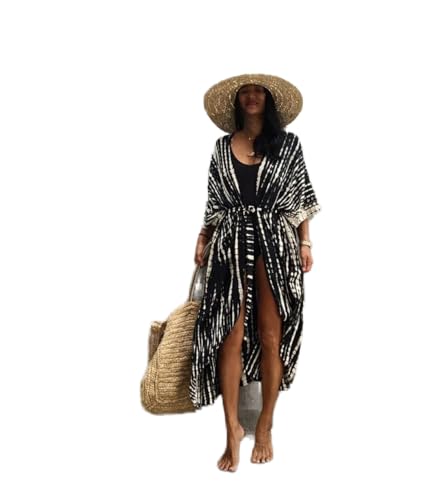 Generic - كاش مايوه كيمونو للشاطئ للسباحة بنمط مصبوغ بالربط باللونين الأسود والأبيض، طول طويل، ملابس سباحة صيفية