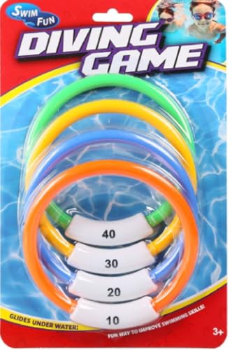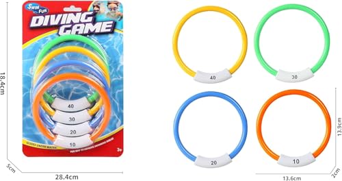 - التدريب تحت الماء: مجموعة من 4 حلقات غوص ملونة مصممة للغوص والانزلاق تحت الماء، مثالية لممارسة السباحة والألعاب.