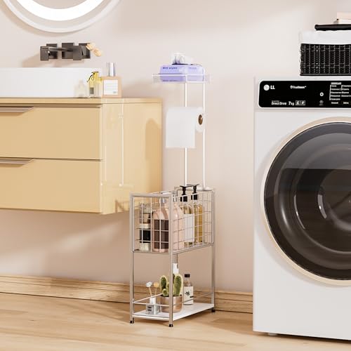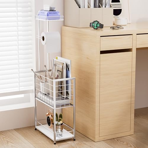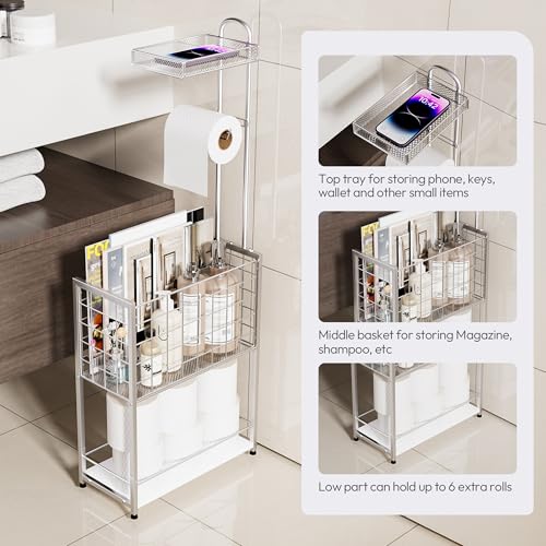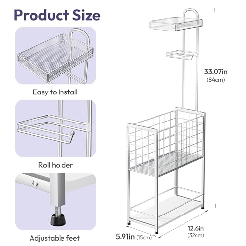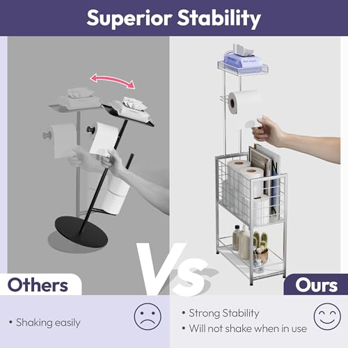 SWTYMIKI - اس دبليو تي واي ميكي حامل ورق تواليت قائم بذاته - حامل ورق تواليت قائم بذاته من 4 طبقات مع سلة كبيرة، رف تخزين للبكرات الإضافية والمجلات والمناديل المبللة، فضي
