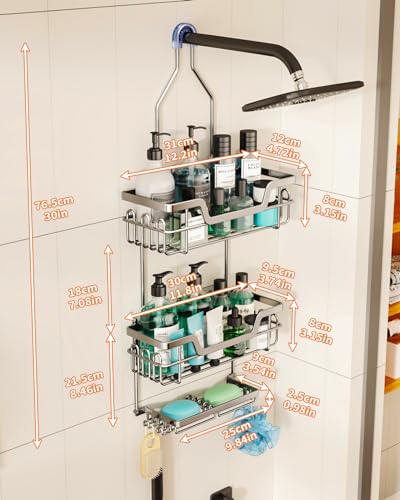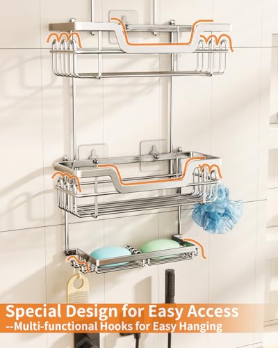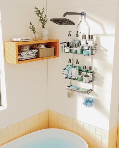 SWTYMIKI - حامل دش معلق، منظم دش من 3 طبقات مقاوم للصدأ فوق رأس الدش مع 16 خطاف وحامل صابون مزدوج، رف دش بسعة كبيرة فوق رأس الدش لغرفة الاستحمام من SWTYMIKI، فضي