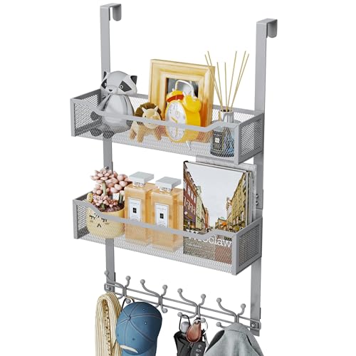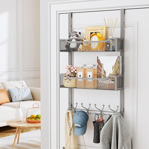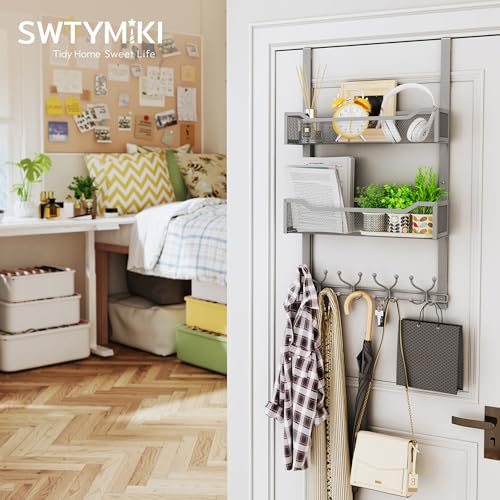 SWTYMIKI - اس دبليو تي واي ميكي منظم خطافات فوق الباب - شماعة باب متعددة الوظائف مع 16 خطاف وسلتين شبكيتين، رف معطف طويل للحمام وغرفة النوم وغرفة المعيشة ومنظم تخزين المنزل، رمادي
