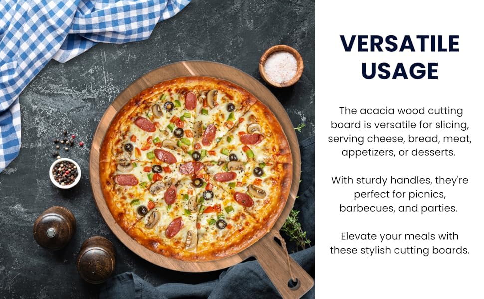 - استخدام متعدد الاستخدامات: مثالي لتقطيع وتقطيع الفواكه والخضروات واللحوم وأكثر من ذلك؛ مثالي أيضًا كطبق بيتزا خشبي أو لوح تقديم.