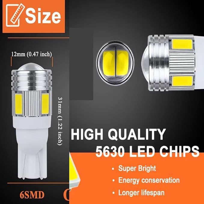 - ✅استهلاك أقل للطاقة - بفضل مصابيح ليد T10 عالية الكفاءة في استهلاك الطاقة والتي يمكن استبدالها بسهولة بواسطة المصابيح الأصلية للحصول على نفس كمية إخراج الضوء، ولكن مع توفير تكاليف التشغيل. كما أنها تتمتع بعمر افتراضي أعلى 30,000 ساعة، لذا مع مصابيح ال اي دي T10 فإنك خالية من تكلفة استبدال المصابيح بشكل متكرر.