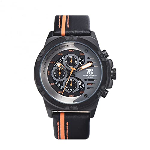 T5 - ساعة جلد لونين دائرية انالوج بعقارب للرجال من تي 5 H3585G-C، اسود
