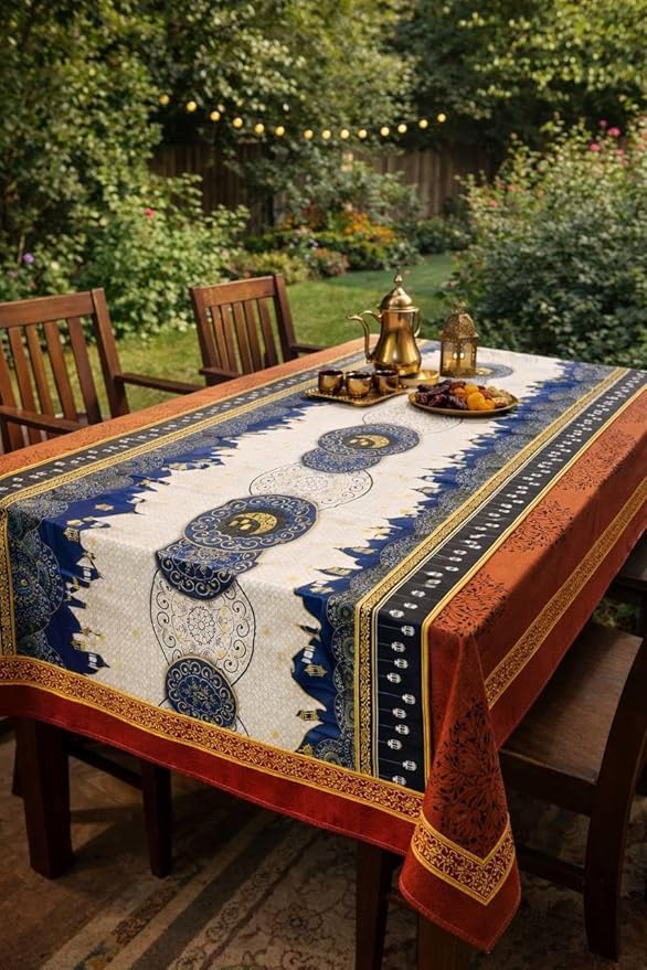 Generic - مفرش طاولة اسلامي لرمضان، مشمع مقاوم للماء، زخارف ذهبية ومساجد وفوانيس رمضان، 183 × 137 سم، متعدد الالوان خامه بلاستك "مشمع"