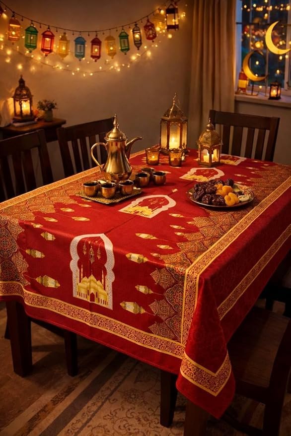 - تصميم احتفالي: تتميز بزخارف ذهبية أنيقة مع مساجد إسلامية تقليدية ونمط فوانيس رمضان، مما يخلق جوًا احتفاليًا أصيلًا لتجمعات رمضان والمناسبات الخاصة
