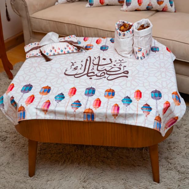 Generic - مفرش طاولة بتصميم فانوس ملون قماش قطيفة ناعم متوفر بأحجام متعددة، مطبوع عليه بفن الخط العربي (90 × 90 سم)
