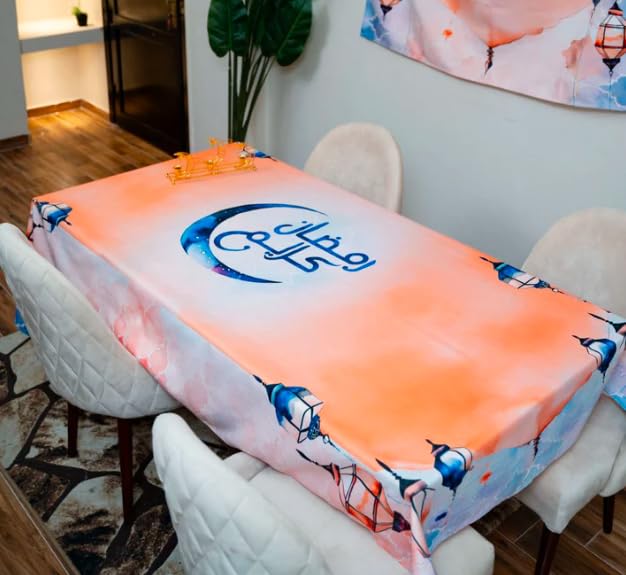 - تصميم أنيق: يتميز بنمط هلال جميل وفانوس بدرجات اللون الخوخي والأزرق، مثالي لإضافة لمسة احتفالية وثقافية إلى مساحة الطعام الخاصة بك