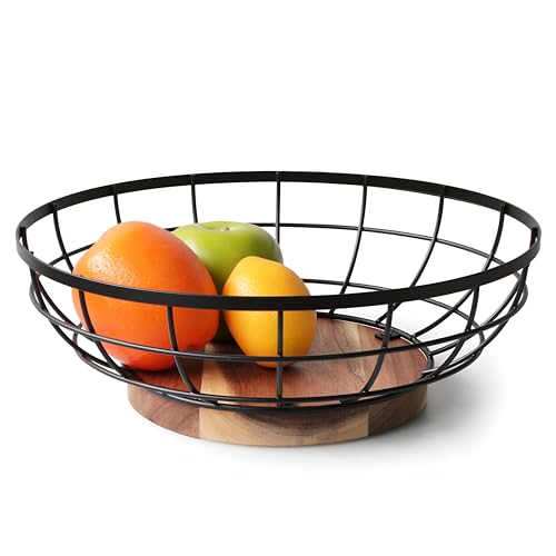 generic - وعاء فاكهة كلاسيكي لسطح الطاولة - حاوية فواكه سلكية سوداء كبيرة مع دعم من خشب الاكاسيا بقطر 12 انش لتخزين الفواكه والخضروات والخبز، ملحق مطبخ انيق
