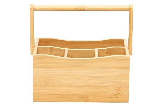 - في لمحة، هذا حامل ومنظم أدوات المطبخ من الخيزران مصمم للجلوس على سطح الطاولة؛ مصنوع من الخيزران الطبيعي، مع مقبض قابل للطي، أربع مساحات تخزين، مظهر أنيق، قابلية الحمل للاستخدام في الهواء الطلق، ومتانة تقاوم البقع.