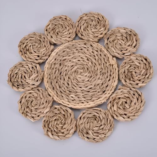 - قاعدة أكواب منسوجة يدويًا مصنوعة من القش الطبيعي بتصميم فريد على شكل وردة، تمزج بين الأناقة والفن لأي إعداد لتناول الطعام أو مشهد تصوير فوتوغرافي.
