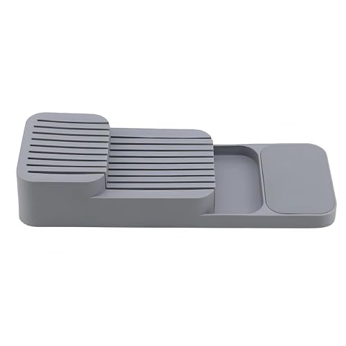 - بالإضافة إلى ذلك، يتميز المنظم بقاعدة غير قابلة للانزلاق تبقيه في مكانه بأمان داخل الدرج، مما يمنع أي انزلاق أو حركة غير مرغوب فيها أثناء فتح الدرج وإغلاقه. يعزز عنصر التصميم المدروس هذا سهولة الاستخدام ويضمن بقاء سكاكينك مخزنة بشكل آمن، مما يقلل من خطر الحوادث. ميزة عدم الانزلاق مفيدة بشكل خاص في الحفاظ على درج مرتب ومنظم، لأنها تساعد على منع الفوضى والحفاظ على الوضع المقصود للسكاكين، عرض ترويجي