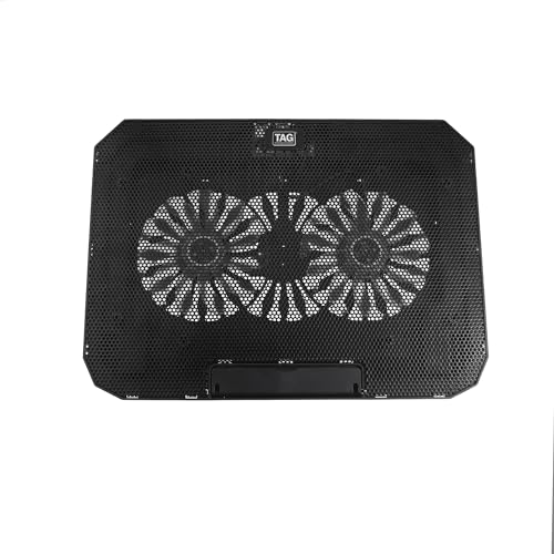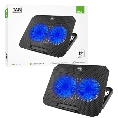 TAG - وسادة تبريد للاب توب فروست من تاج، مراوح ليد زرقاء مزدوجة مثبتة مسبقا 14 سم تأتي مع تحكم في السرعة لتبريد مثالي، وسادة مع منفذي USB و8 مستويات لضبط الارتفاع، دعم لاب توب حتى 17 بوصة