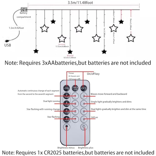- 【سهل الاستخدام】يعتمد مصباح الستارة على شكل نجمة وهو مناسب لأي مناسبة. خفيفة الوزن وسهلة التعليق في أي مكان. يعمل المصباح بثلاث بطاريات ايه ايه (البطاريات غير متوفرة في الصندوق)، أو يمكن تشغيل مصابيح ستارة LED للكريسماس بواجهة USB، طريقتان لتختار من بينها، مصابيح LED والأشكال ستضفي شعورًا دافئًا على أي غرفة.