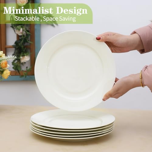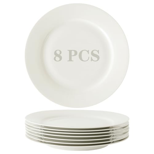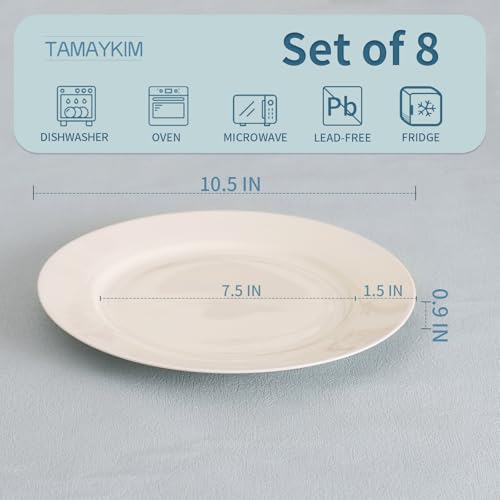 TAMAYKIM - تامايكيم اطباق عشاء من البورسلين مقاس 10.5 انش من 8 قطع، اطباق حلوى، اطباق مقبلات، مجموعة ادوات مائدة دائرية لتقديم السلطة، مقاومة للخدش، امنة للاستخدام في الميكروويف والفرن وغسالة الصحون، ابيض