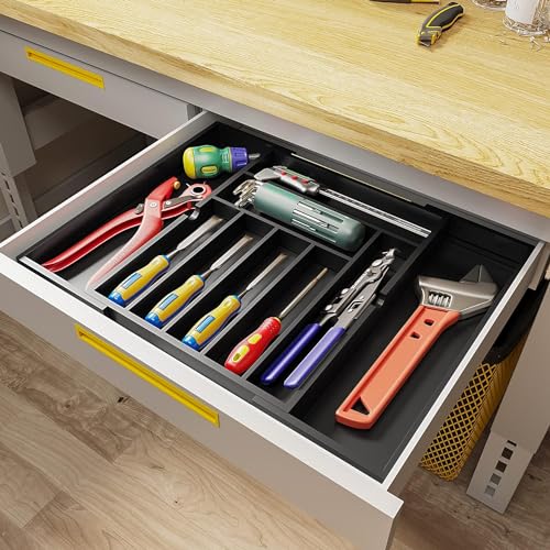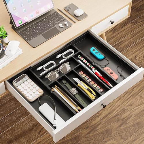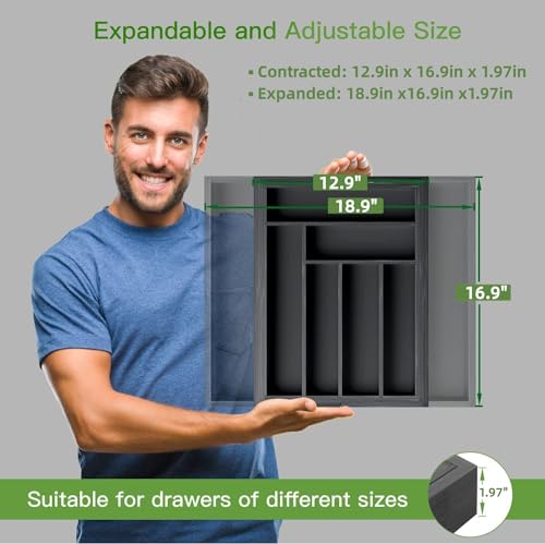 - 【لا يحتاج إلى تجميع】 منظم درج الأدوات الفضية سهل الاستخدام، فقط اضبط العرض بمرونة وفقًا لحجم الدرج. المقاس غير المطوي حوالي 12.9 انش (طول) × 16.9 (عرض) × 1.97 انش (ارتفاع)، ويمكن تمديد العرض حتى 18.9 انش، وهو أكثر ملاءمة للأدراج الكبيرة أو أسطح المناضد. يوصى بقياس أدراجك قبل الطلب لتجنب أي إزعاج.
