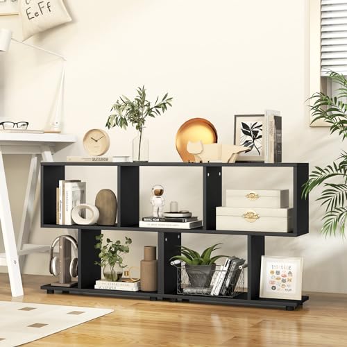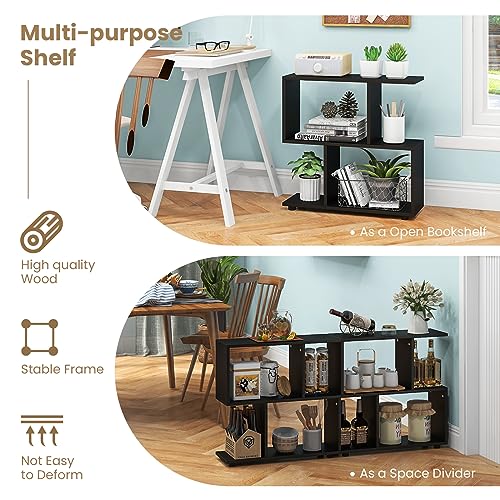 Tangkula - تانج كوالا رف كتب هندسي من طبقتين عرض خشبي قائم بذاته مقسم غرفة ديكور المنزل والمكتب خزانة مفتوحة على شكل حرف S صغير للمساحات الصغيرة المعيشة النوم الدراسة 1 اسود