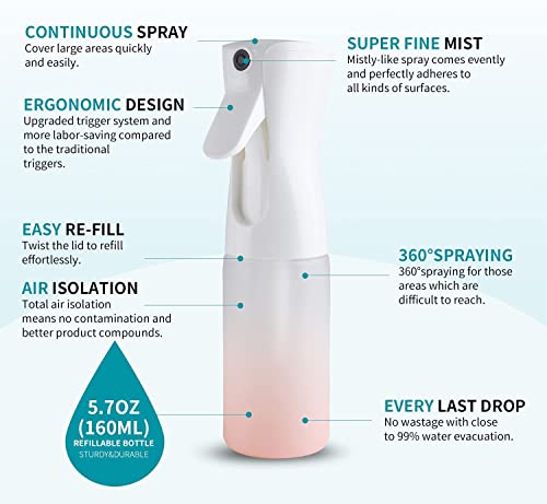 - 【زجاجات بخاخ شعر بزاوية 360 درجة】تسمح زجاجة الرش المستمر بالرش بزاوية 360 درجة للمناطق التي يصعب الوصول إليها. يمكنك حتى استخدامه جانبيًا ورأسًا على عقب دون تسرب أو فقدان برايم، وبالتالي يمكن الوصول إلى جميع المناطق، حتى تتمكن من استخدام آخر قطرة من السائل.