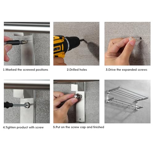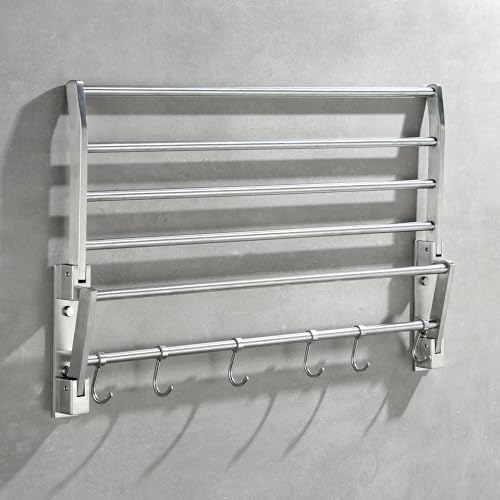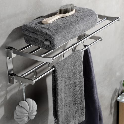 Taozun - تاوزون رف مناشف 24 انش للحمام، رف مناشف الحمام من الستانلس ستيل مع قضيب منشفة، رف مناشف الفندق يثبت على الحائط مع خطافات، حامل مناشف مصقول قابل للطي