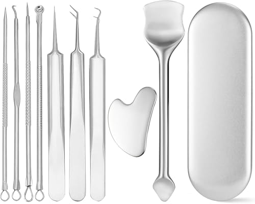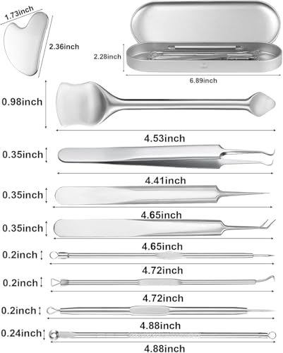 Tazweeq - مجموعة أدوات إزالة الرؤوس السوداء، طقم أدوات إزالة البثور من الفولاذ المقاوم للصدأ، ملعقة مسطحة للوجه، مجموعة أدوات العناية بالبشرة مع حافظة معدنية من تزويق، 10 قطع