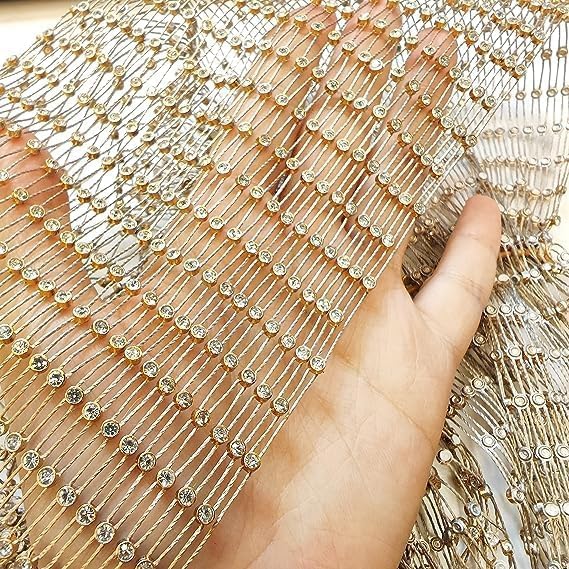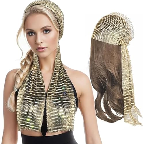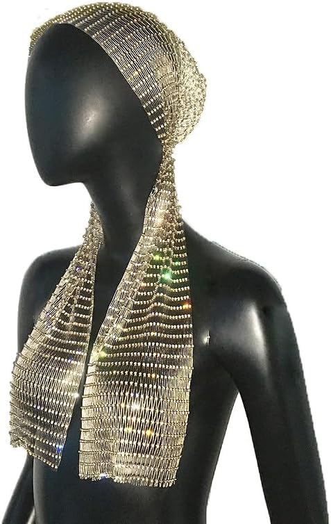 Tazweeq - رباط للرأس شبكي مرصع بحجر راين من تزويق، سكارف رأس طويل وعريض وكريستالي لامع للنساء والبنات، باندانا مرنة واسعة، اكسسوارات شعر للملهى الليلي (ذهبي)