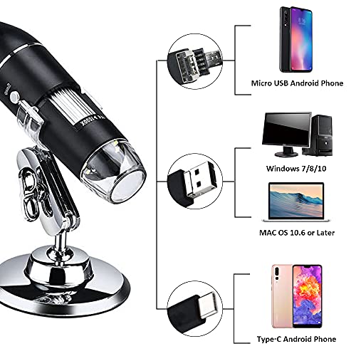 tbear - ميكروسكوب ديجيتال 3 في 1 بمنفذ USB وMicro USB نوع سي بكاميرا تكبير حتى 1000 مزودة بـ8 لمبات LED مع مسند بتصميم محمول يتوافق مع ويندوز اكس بي و7 و8 و10 وفيستا ولينكس وماك ونظام اندرويد