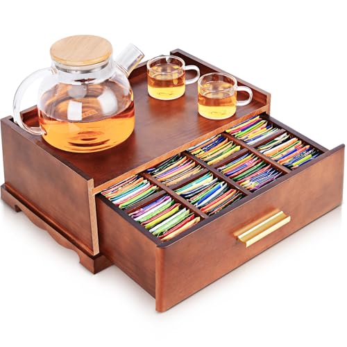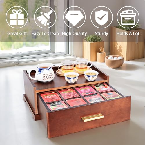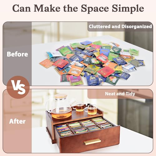 Essenya - منظم اكياس الشاي، منظمات وتخزين الشاي، صندوق تخزين منظم صندوق الشاي، منظم محطة الشاي لسطح الطاولة، علبة شاي لتنظيم حامل الشاي الخشبي، تخزين الشاي لادراج قابل للازالة (بني)