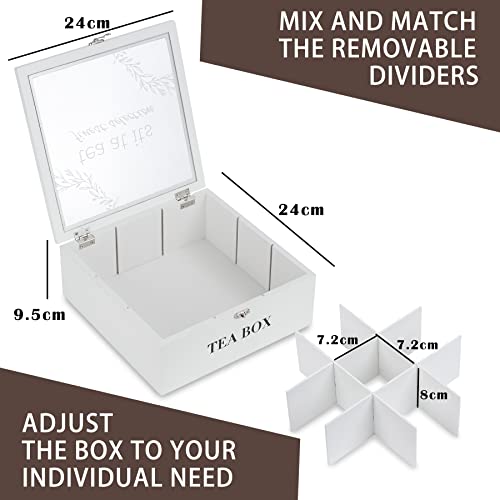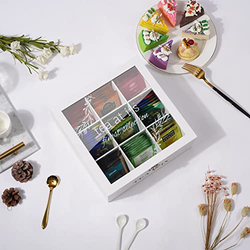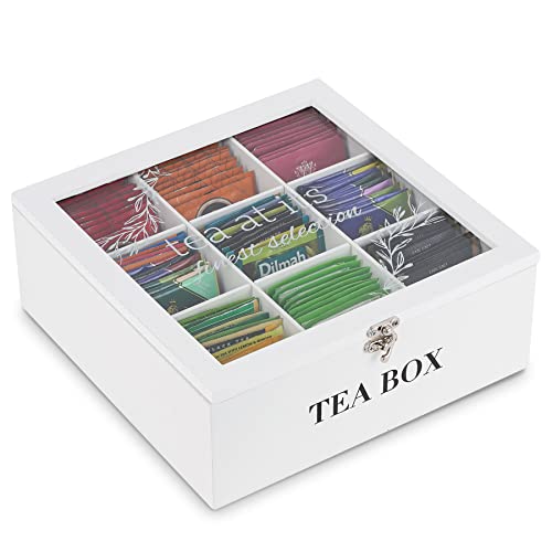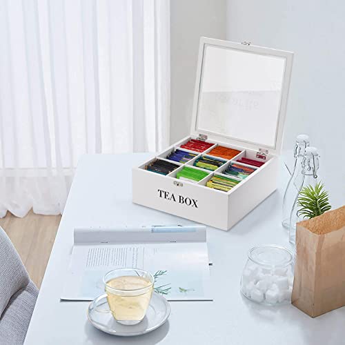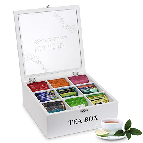 QILICZ - صندوق شاي خشبي، حامل اكياس الشاي، منظم اكياس الشاي، صندوق تخزين الشاي مع 9 مساحات تخزين وغطاء زجاجي للاستخدام المنزلي وهدية الكريسماس، أبيض