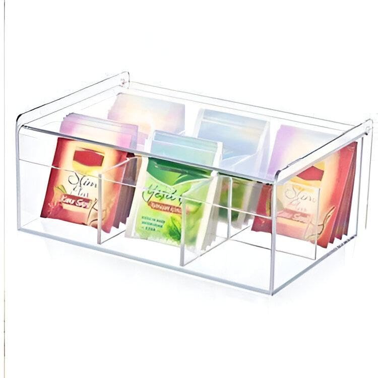 - مصنوع من الأكريليك الشفاف الفاخر، يتميز هذا المنظم بـ 6 مساحات تخزين واسعة يبلغ مقاسها تقريبًا 21.5 × 14.6 × 9.5 سم، مما يسمح لك بعرض أكياس الشاي الخاصة بك والوصول إليها بدقة مع الحفاظ على لمسة أنيقة وعصرية تعزز بسلاسة أي طاولة مطبخ أو رف مخزن أو مكتب مكتب.